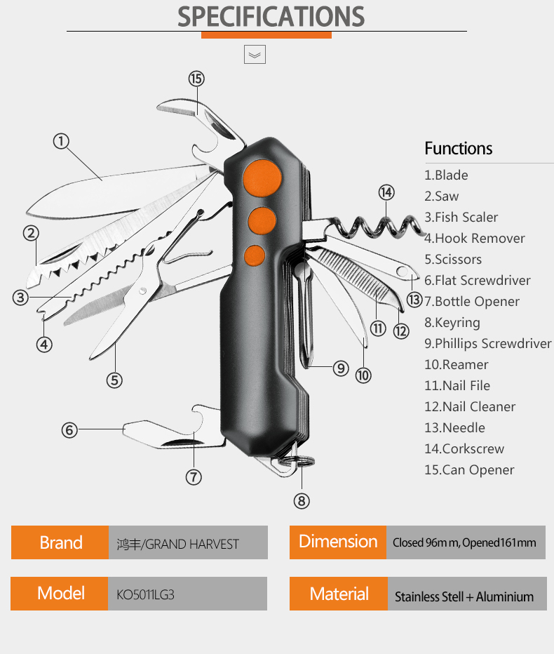 A:Our main product is Multi function knife,pocket knife,folding knife, gift knife, outdoor camping tools and Survival knife, muti tools.